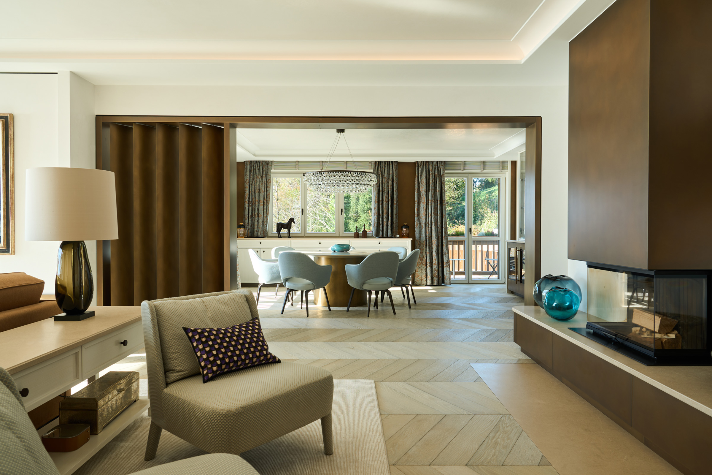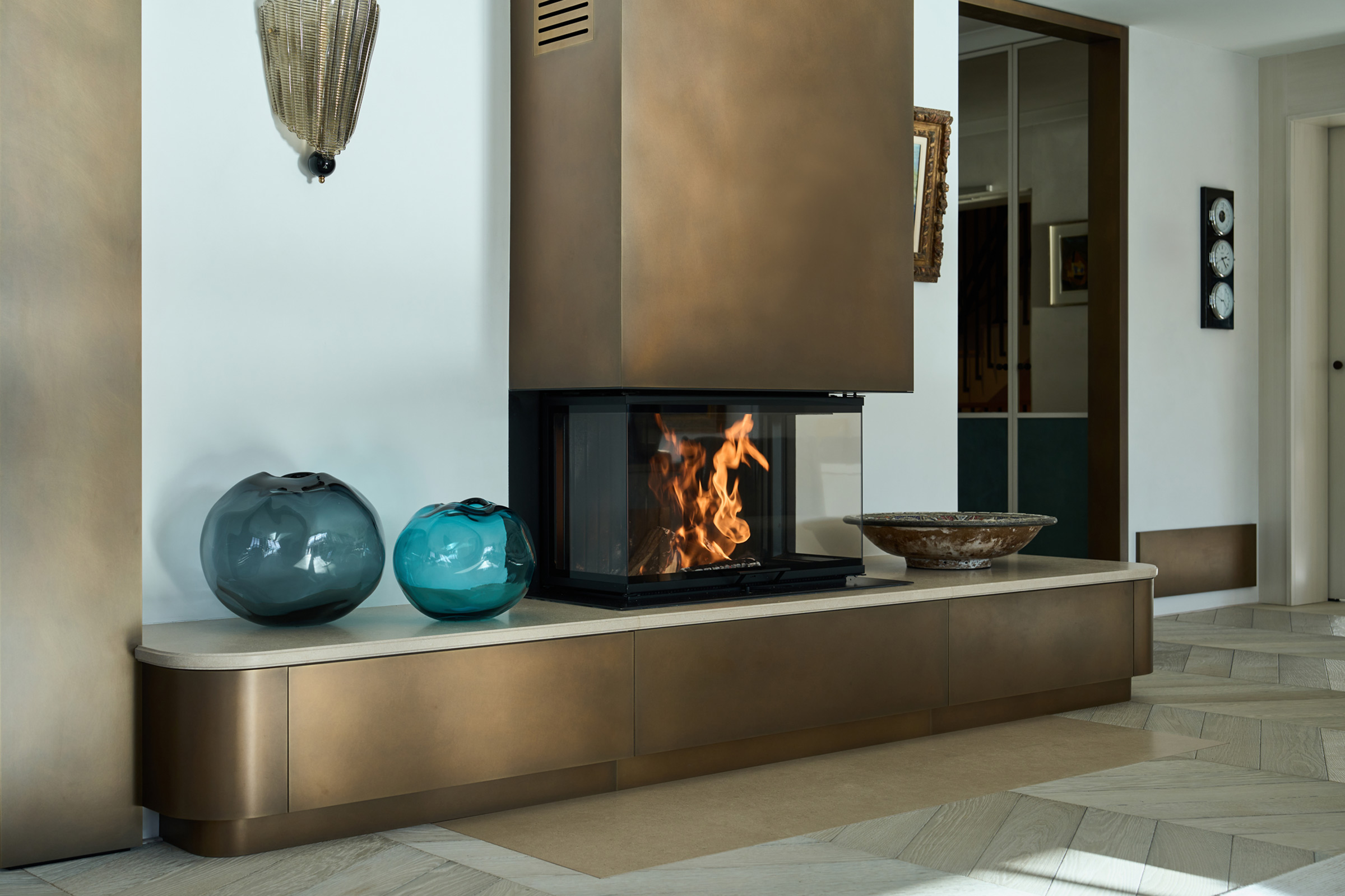Die Messingverkleidung verleiht dem Kamin eine warme, edle Ausstrahlung, die je nach Lichteinfall lebendig changiert und dem Raum eine besondere Tiefe gibt. Die sanften Rundungen im Sockel nehmen dem massiven Material die Strenge und verleihen dem Panoramakamin eine zeitlose Eleganz. So verbindet er repräsentative Größe mit wohnlicher Weichheit - perfekt für ein Haus, das Geschichte und Moderne vereint.