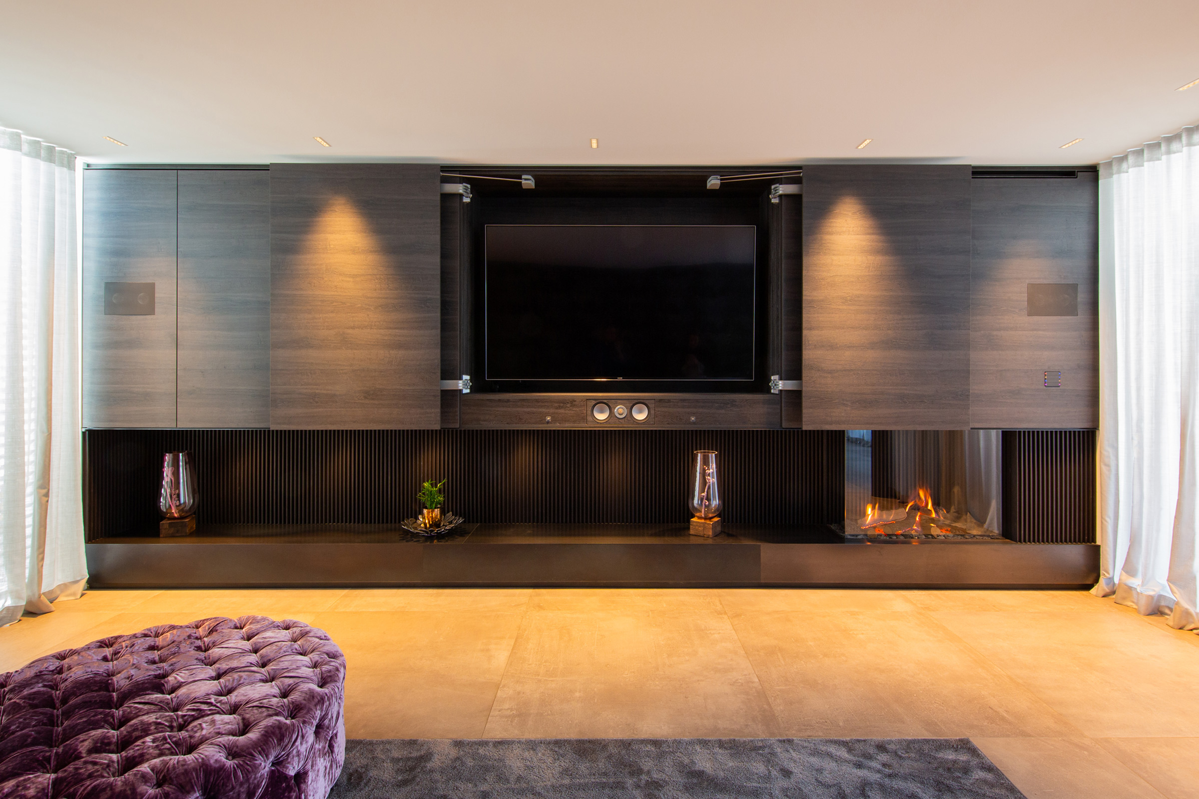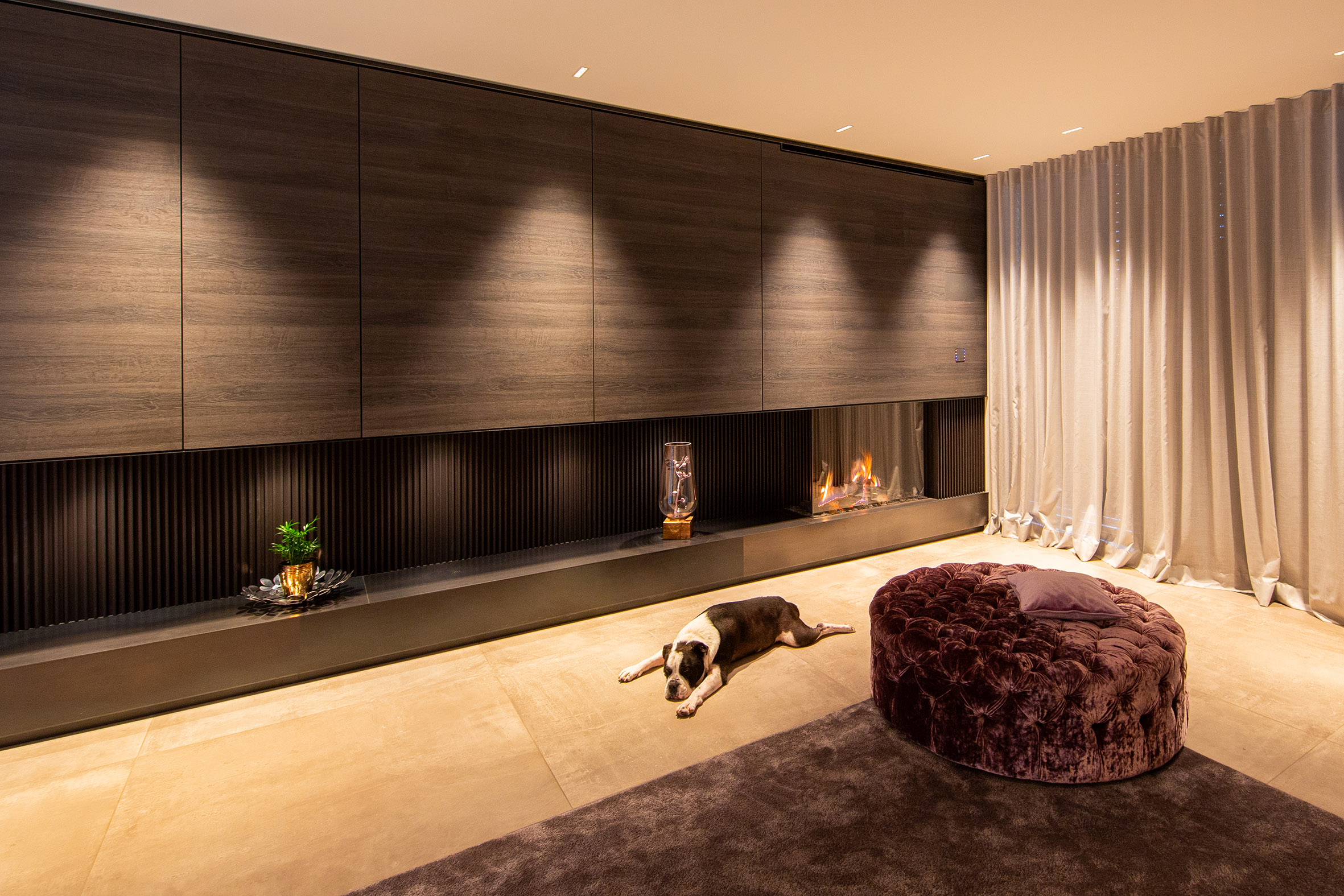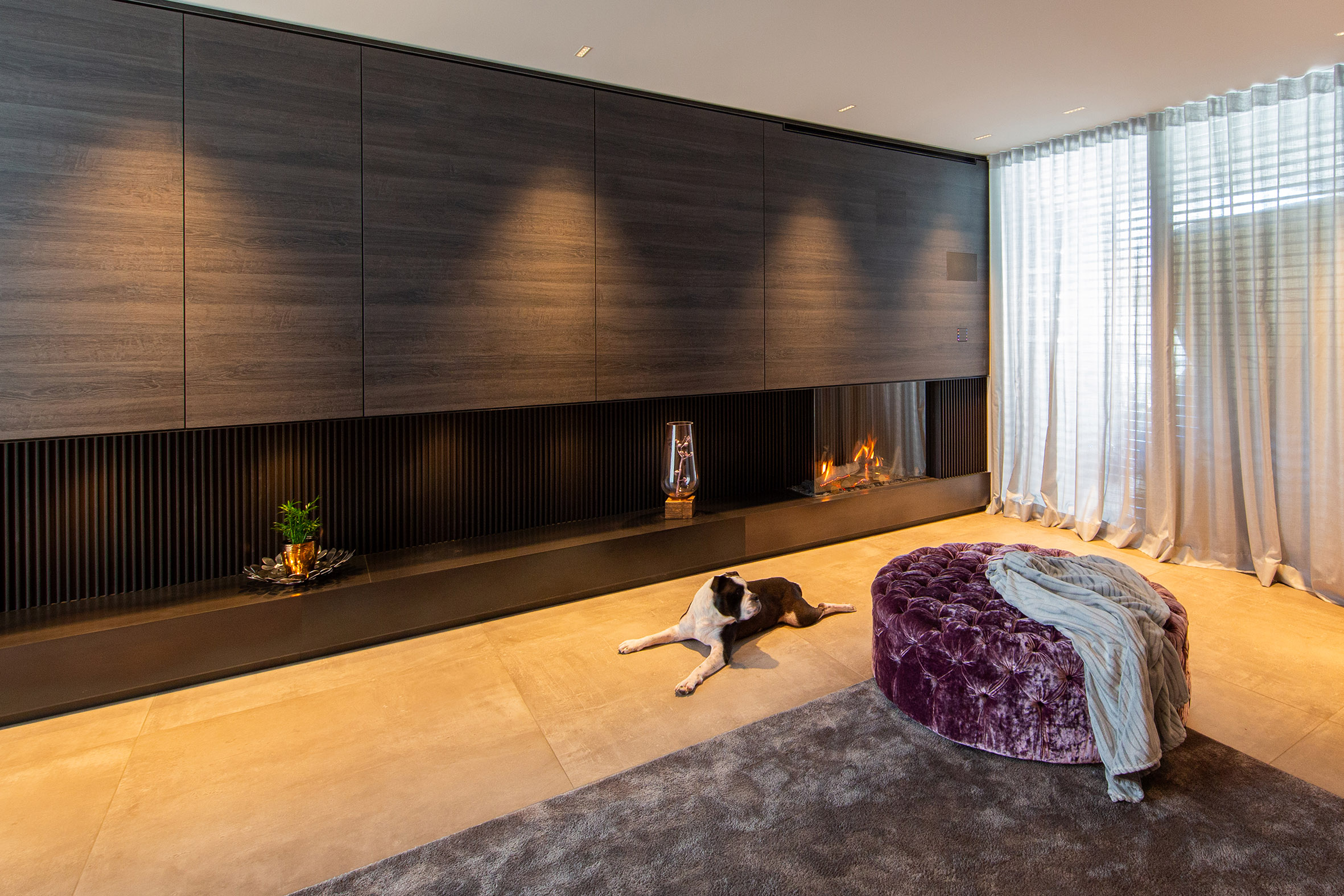 Ein in ein Möbelstück integrierter Gaskamin verkörpert die perfekte Verschmelzung von Eleganz und Funktionalität. Die Flammen tanzen hinter einer Ecksichtscheibe, die von edlen Materialien wie Designlamellen aus Stahl und warmen Holz umrahmt wird. Hinter dem Möbeleinbau verbirgt sich ein geschickt integrierter Fernseher, der sich bei Bedarf nahtlos in die Wohnlandschaft einfügt. Durch die raffinierten Details und die präzise Verarbeitung wird der Gaskamin zum Herzstück des Wohnbereichs, das nicht nur funktional, sondern auch ästhetisch ansprechend ist. Der Hund wirkt vollkommen entspannt und geborgen und sein friedliches Dasein verstärkt die heimelige Atmosphäre der modernen Umgebung.
