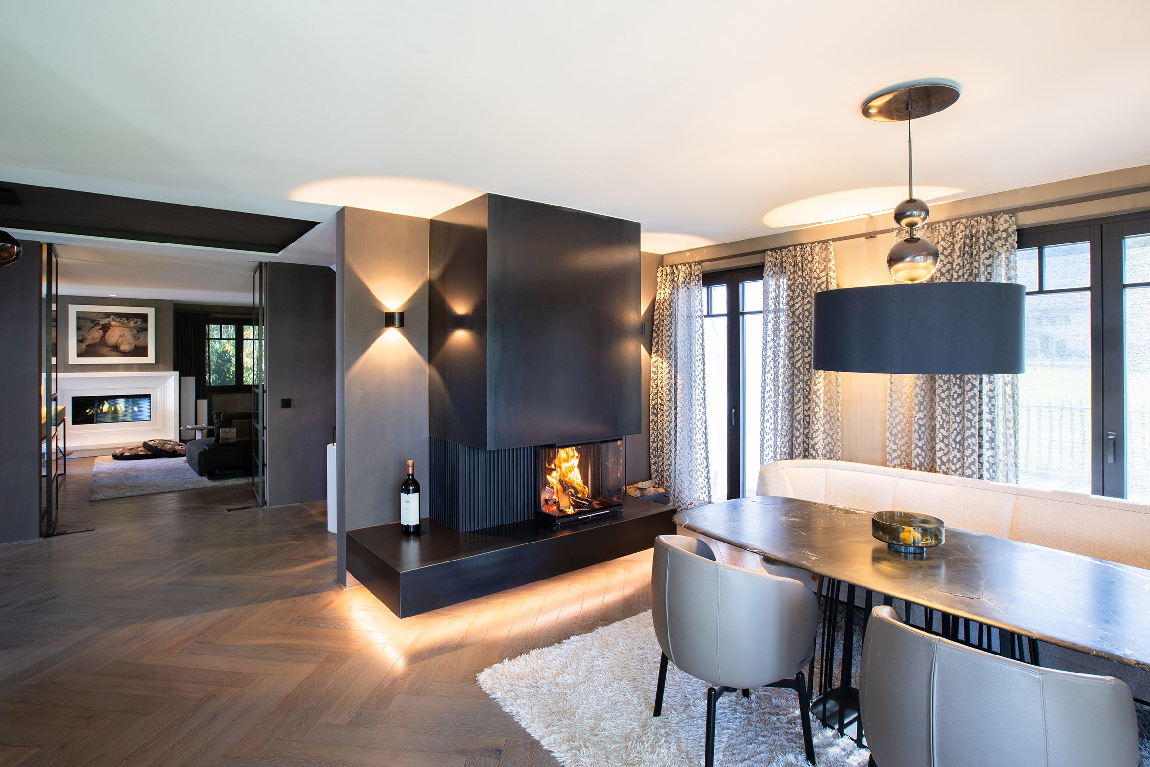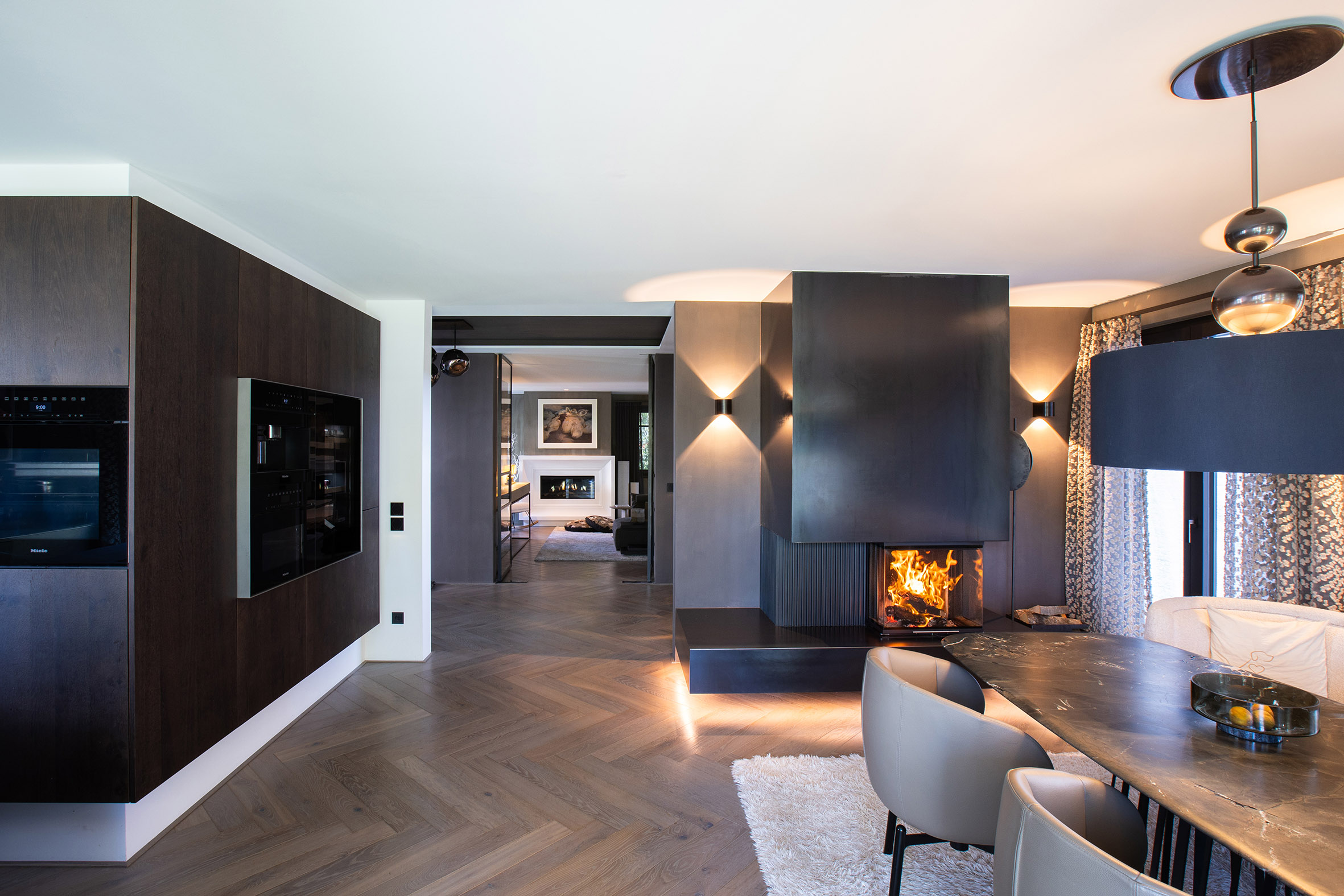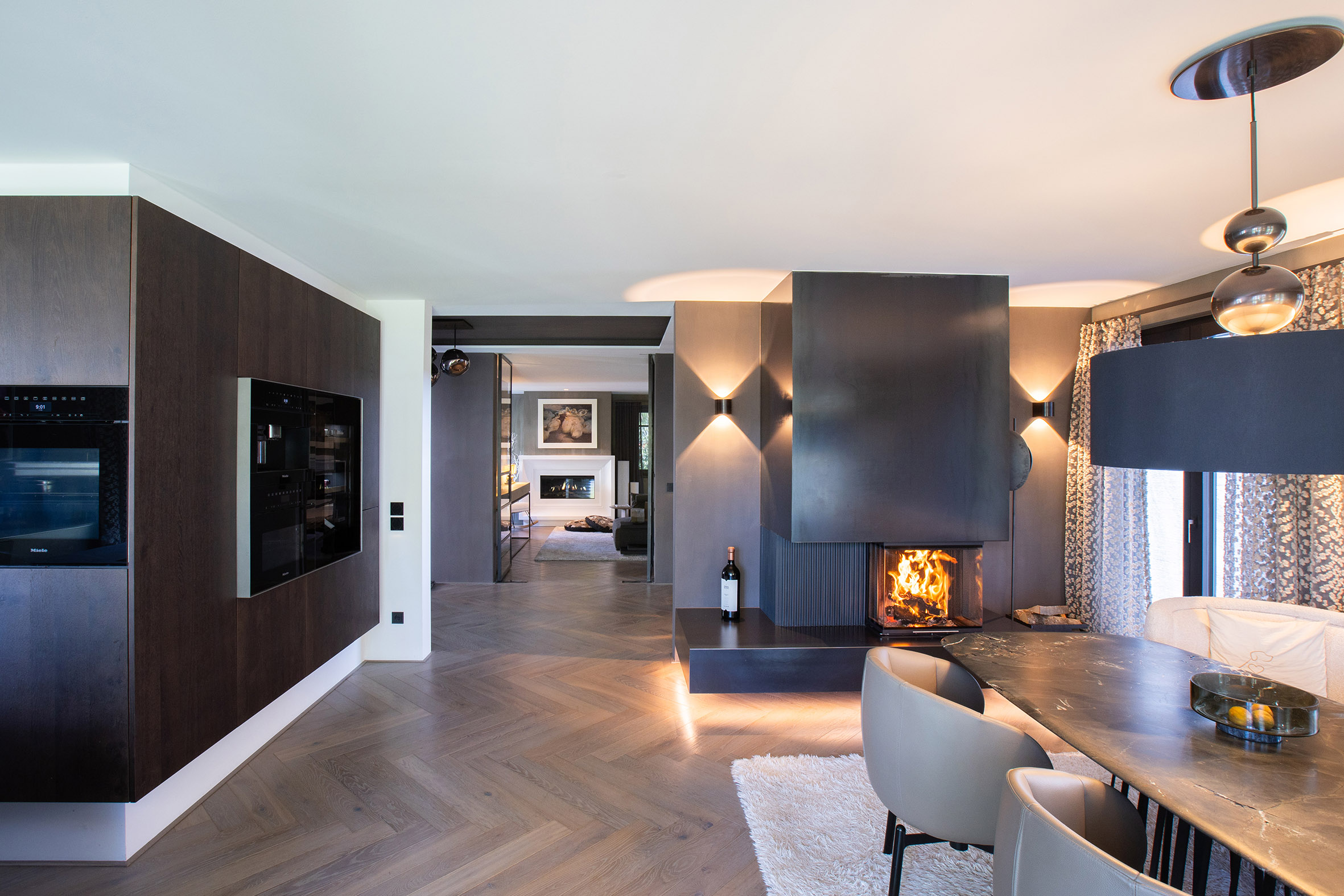 Ein sehr außergewöhnliches Zuhause, wo Innovation, Ästhetik und Handwerkskunst auf höchstem Niveau vereint sind. Die schwebende Konstruktion und die edlen Designlamellen verleihen dem Panoramakamin eine einzigartige Leichtigkeit, während der Rohstahlfeuertisch die rustikale Note einbringt, die das Gesamtbild abrunden. Neben der optischen Gestaltung bietet der Kaminofen einen Treffpunkt für Familie und Freunde, die sich gerne um das Feuer versammeln und gemeinsame Stunden genießen.