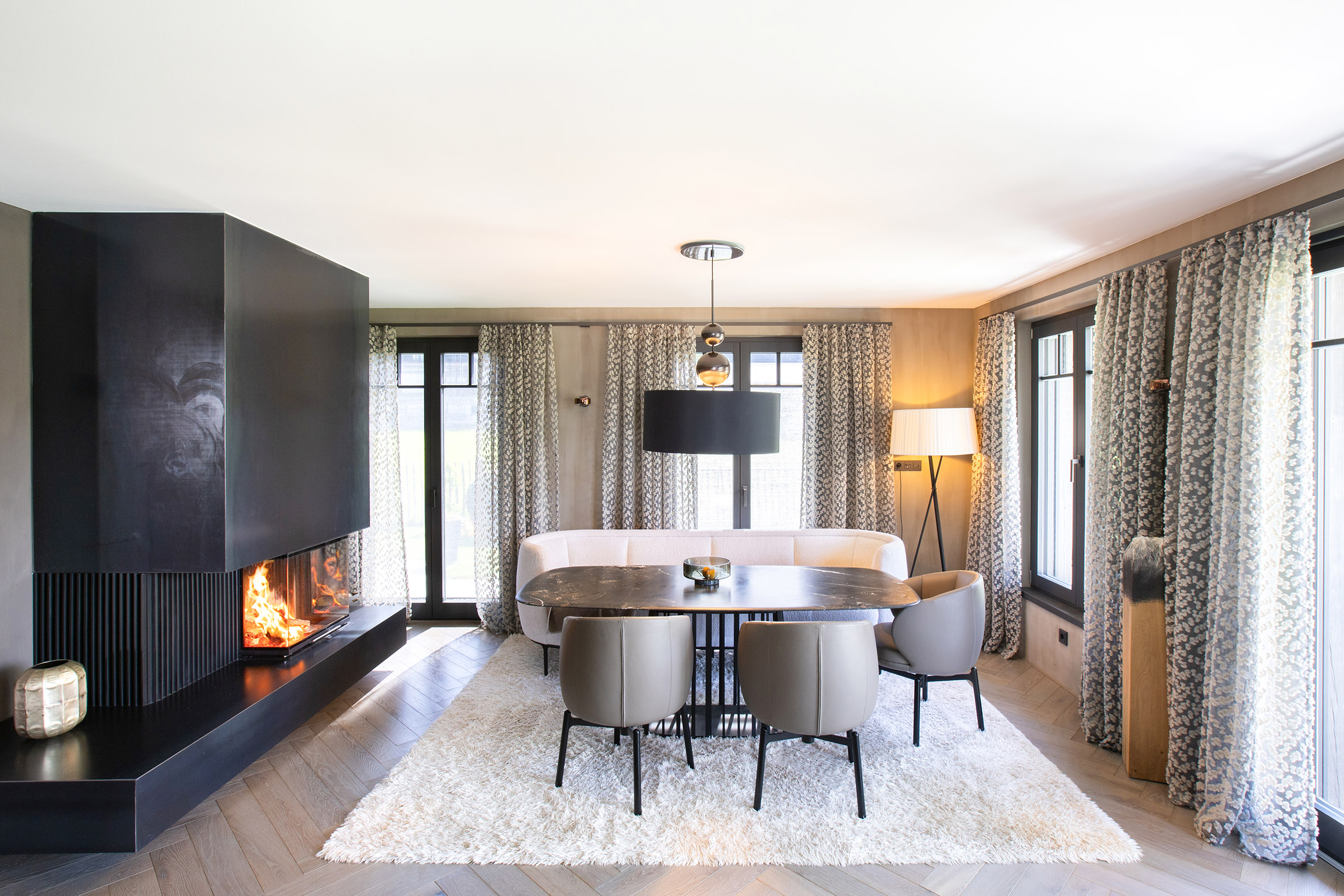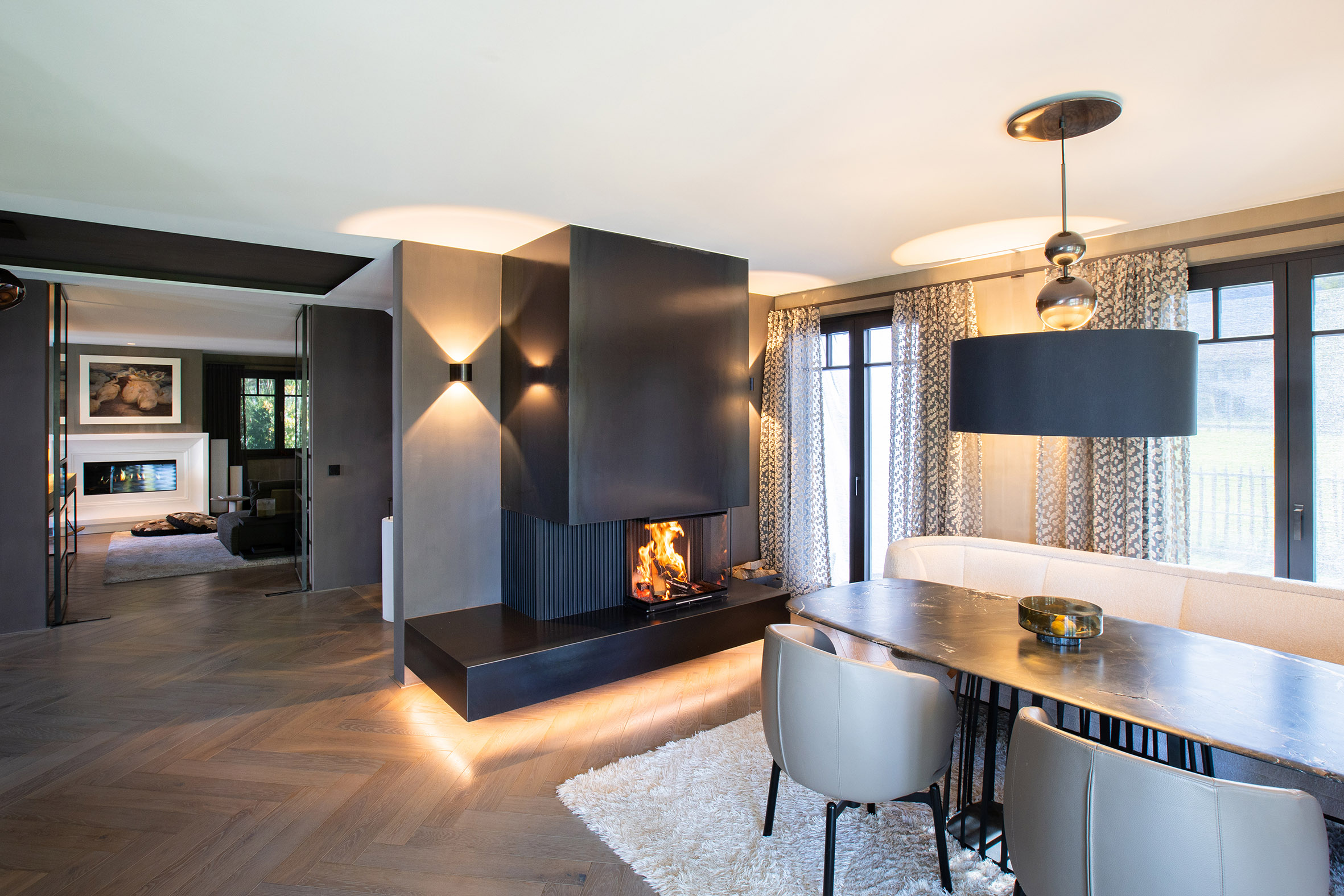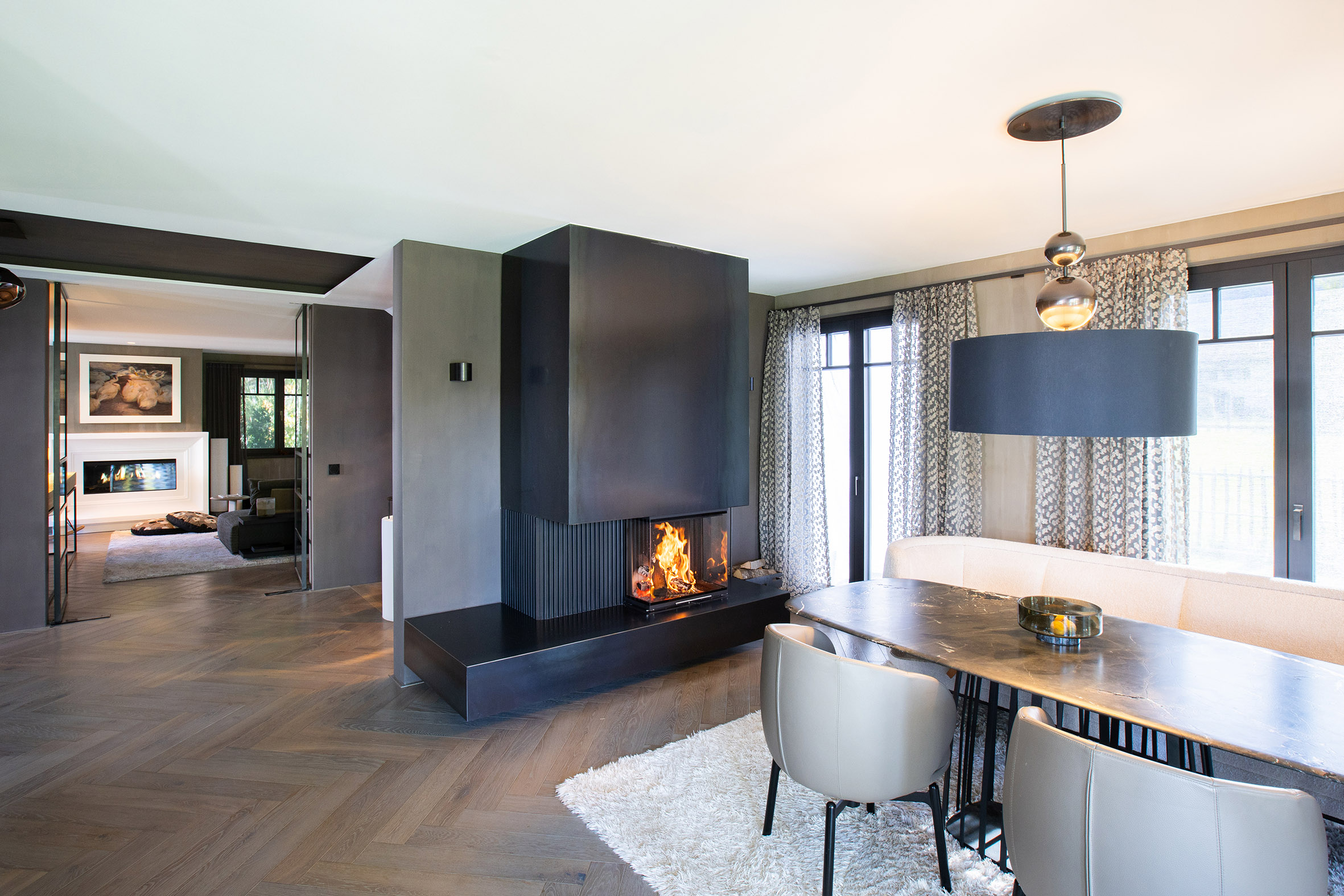 Ein sehr außergewöhnliches Zuhause, wo Innovation, Ästhetik und Handwerkskunst auf höchstem Niveau vereint sind. Die schwebende Konstruktion und die edlen Designlamellen verleihen dem Panoramakamin eine einzigartige Leichtigkeit, während der Rohstahlfeuertisch die rustikale Note einbringt, die das Gesamtbild abrunden. Neben der optischen Gestaltung bietet der Kaminofen einen Treffpunkt für Familie und Freunde, die sich gerne um das Feuer versammeln und gemeinsame Stunden genießen.