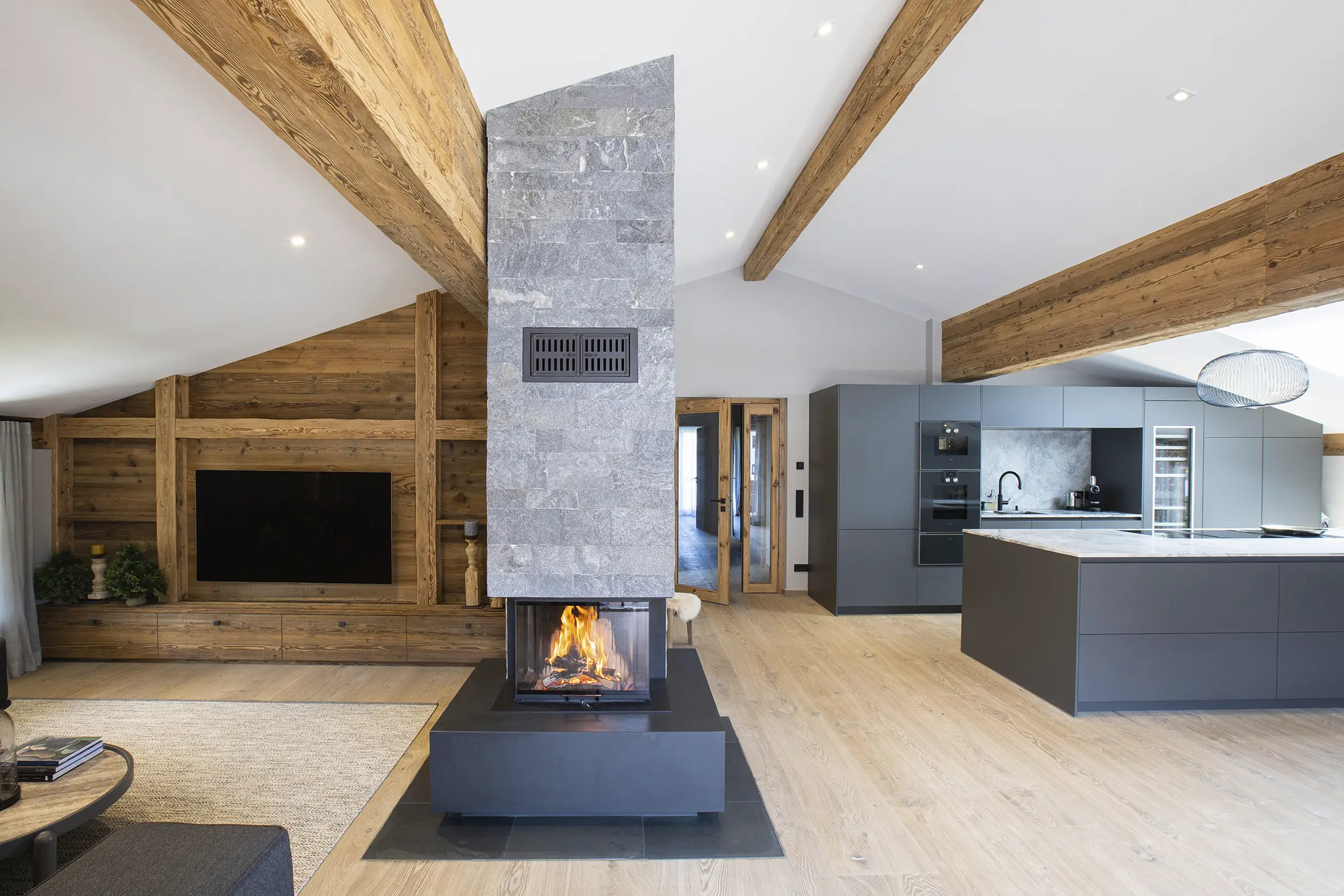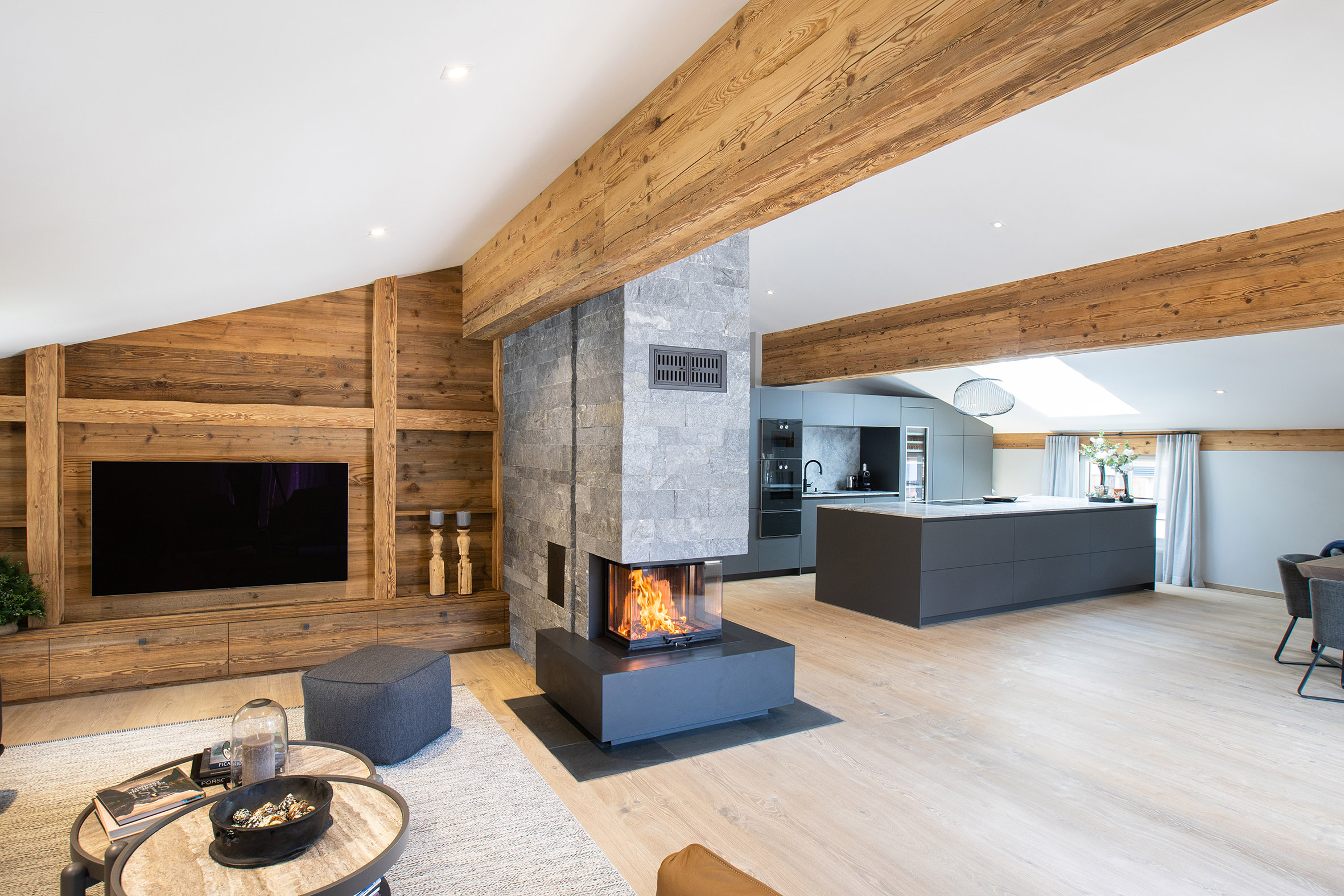 In diesem wunderschönen Haus am Tegernsee thront ein Panoramakamin als zentrales Element und verleiht dem Raum eine unvergleichliche Ausstrahlung, die perfekt zum Charme der ländlichen Umgebung passt. Dieser Kamin ist ein charakteristisches Schmuckstück, das den gesamten Wohnbereich dominiert. Die Verwendung besonderer Materialien wie Naturstein und Stahl unterstreichen die luxuriöse und zugleich rustikale Ästhetik des Holzkamins.