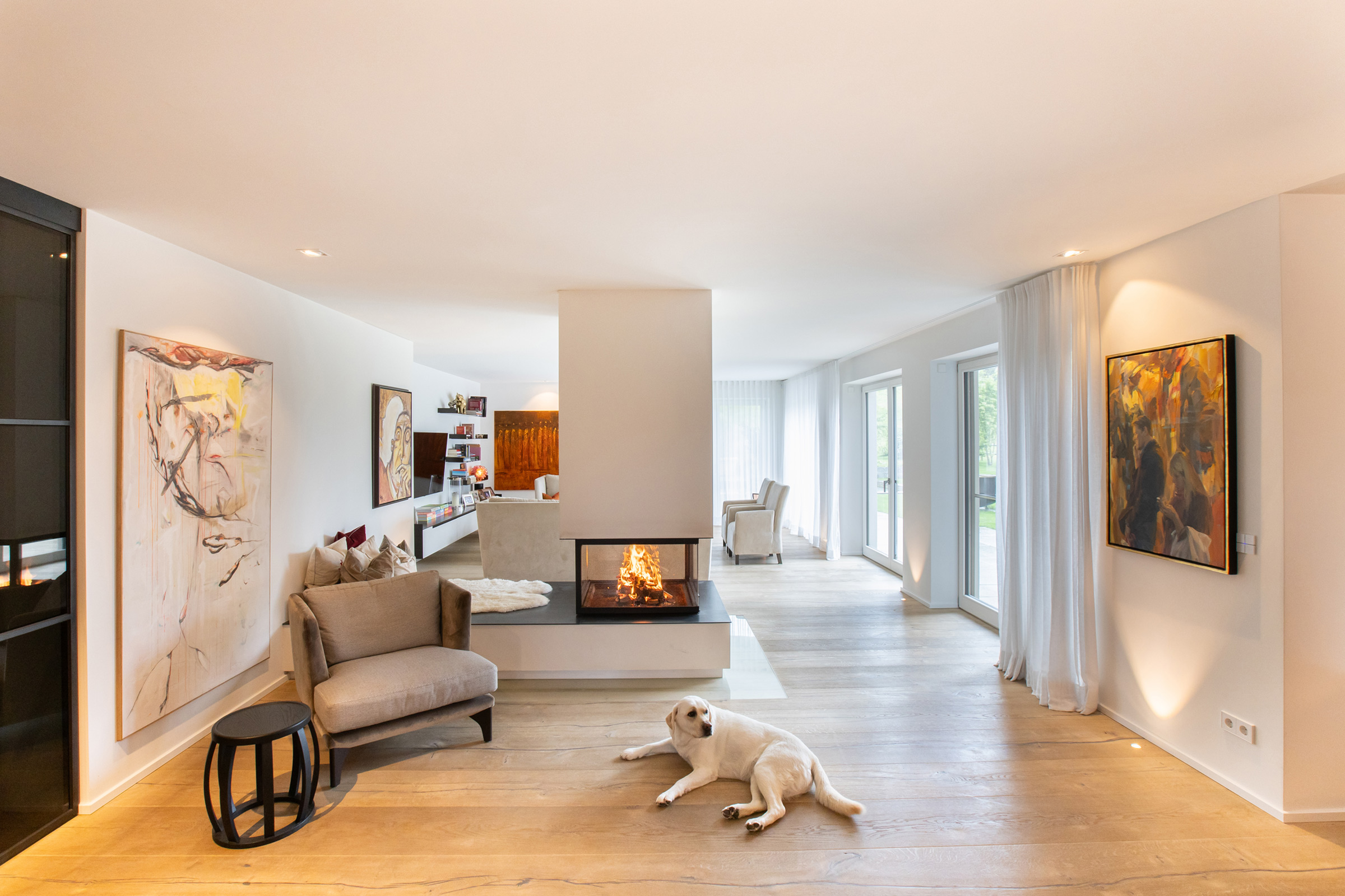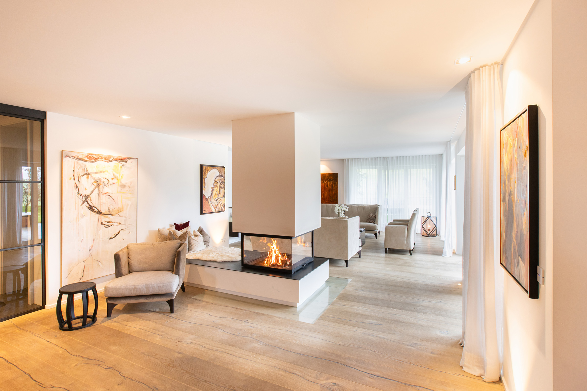 Ein vierseitiger Kamin weckt Emotionen und verwandelt Räume. Durch seine moderne und klare Linienführung fügt sich der Kamin nahtlos in das puristische Interior ein. Er ergänzt das minimalistischen Designprinzipien und verleiht dem Raum eine warme Note.